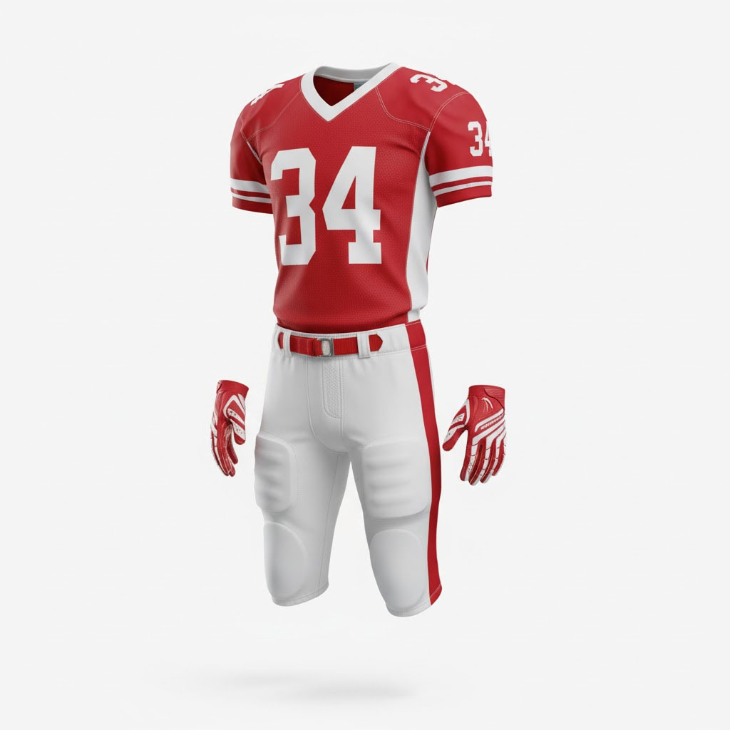 This complete uniform set features a high-visibility Red and White color scheme with the prominent Number 34 on the jersey. The uniform is designed for durability and comfort that mimics on-field professional gear: