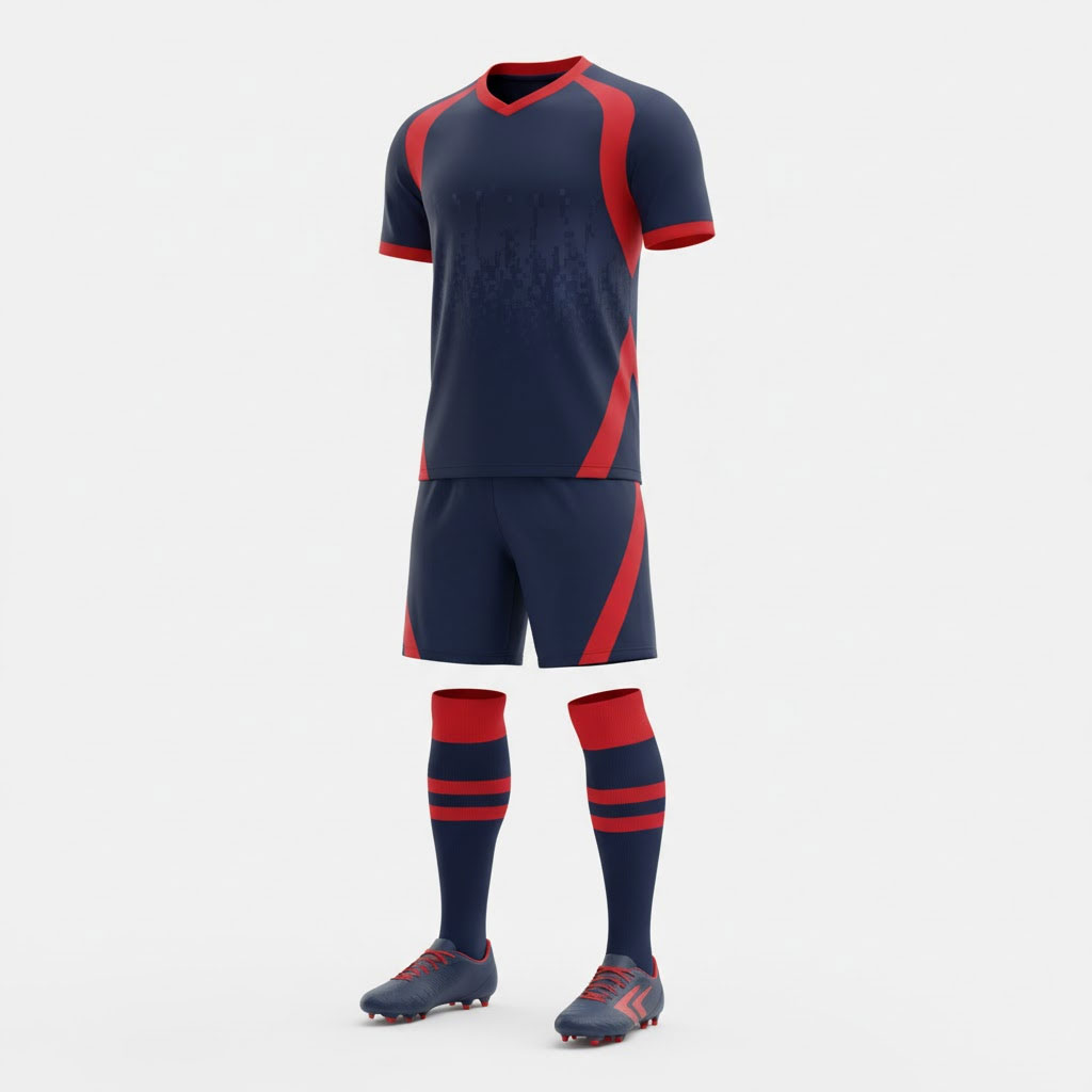 This complete kit features the powerful Navy Blue and Red color scheme, but the jersey introduces a modern edge with a subtle, tonal geometric/cityscape pattern across the chest. This design element sets your team apart while maintaining a classic, strong presence.