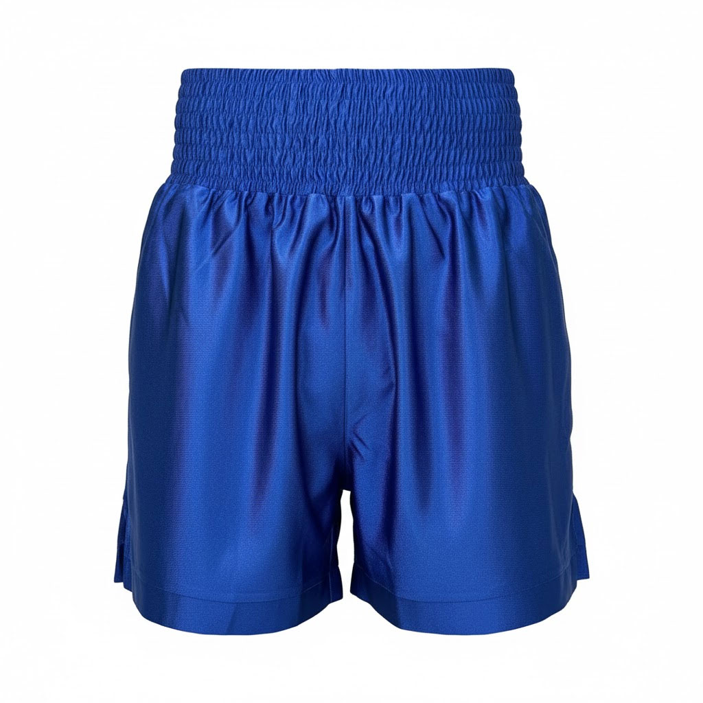 Stunner Wears Classic Blue Satin Boxing Trunks featuring a mid-thigh cut and a high, ruched elastic waistband. Engineered from lightweight, premium satin for a professional ring aesthetic and completely unrestricted movement and comfort during training and competition.