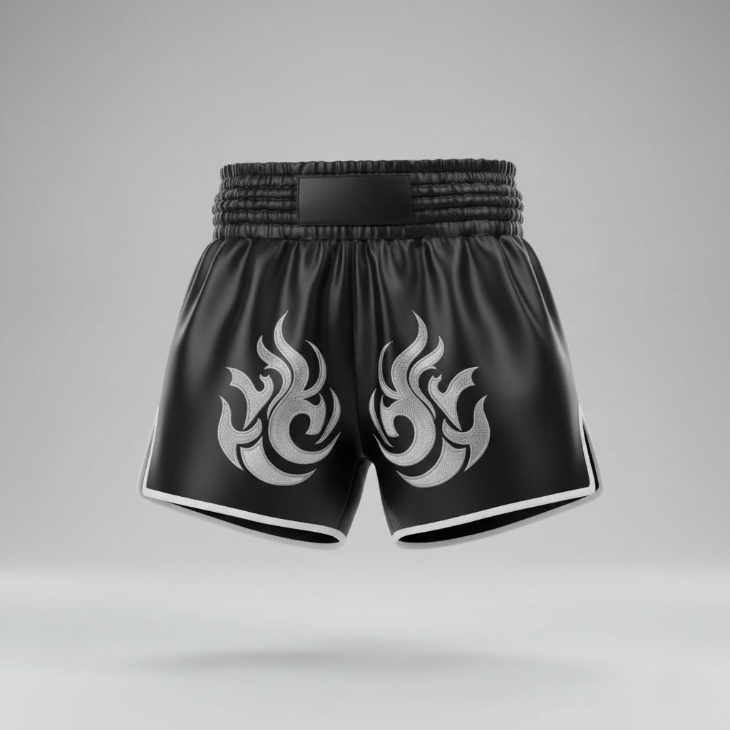 The aesthetic is anchored by striking, high-definition embroidered flame motifs in white/silver on both legs, symbolizing passion and ferocity. The traditional elasticated waistband with multiple stitching channels ensures a snug, secure fit that stays put through the toughest training sessions and championship rounds. Minimal piping along the hem provides a clean, classic finish.