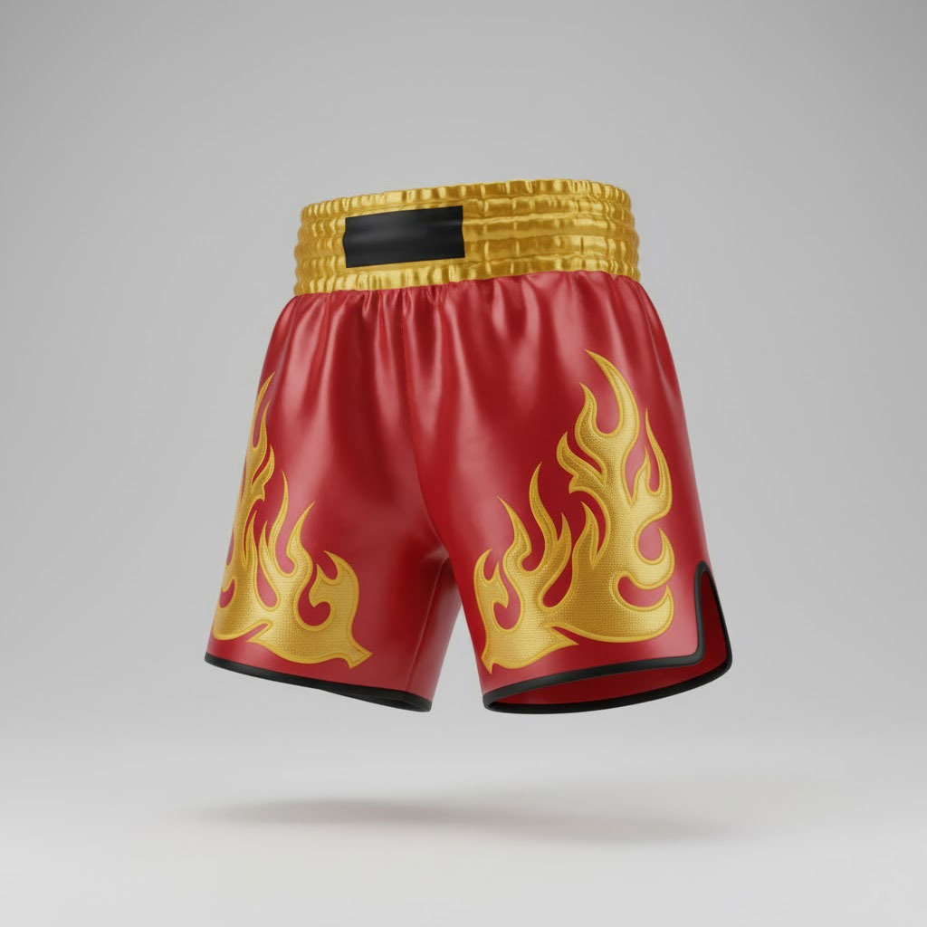 Crafted from premium, resilient satin-finish fabric in a bold, vibrant Red, these shorts embody confidence. The design features large, intricate gold flame embroidery on both legs, symbolizing rebirth, strength, and relentless striking power.