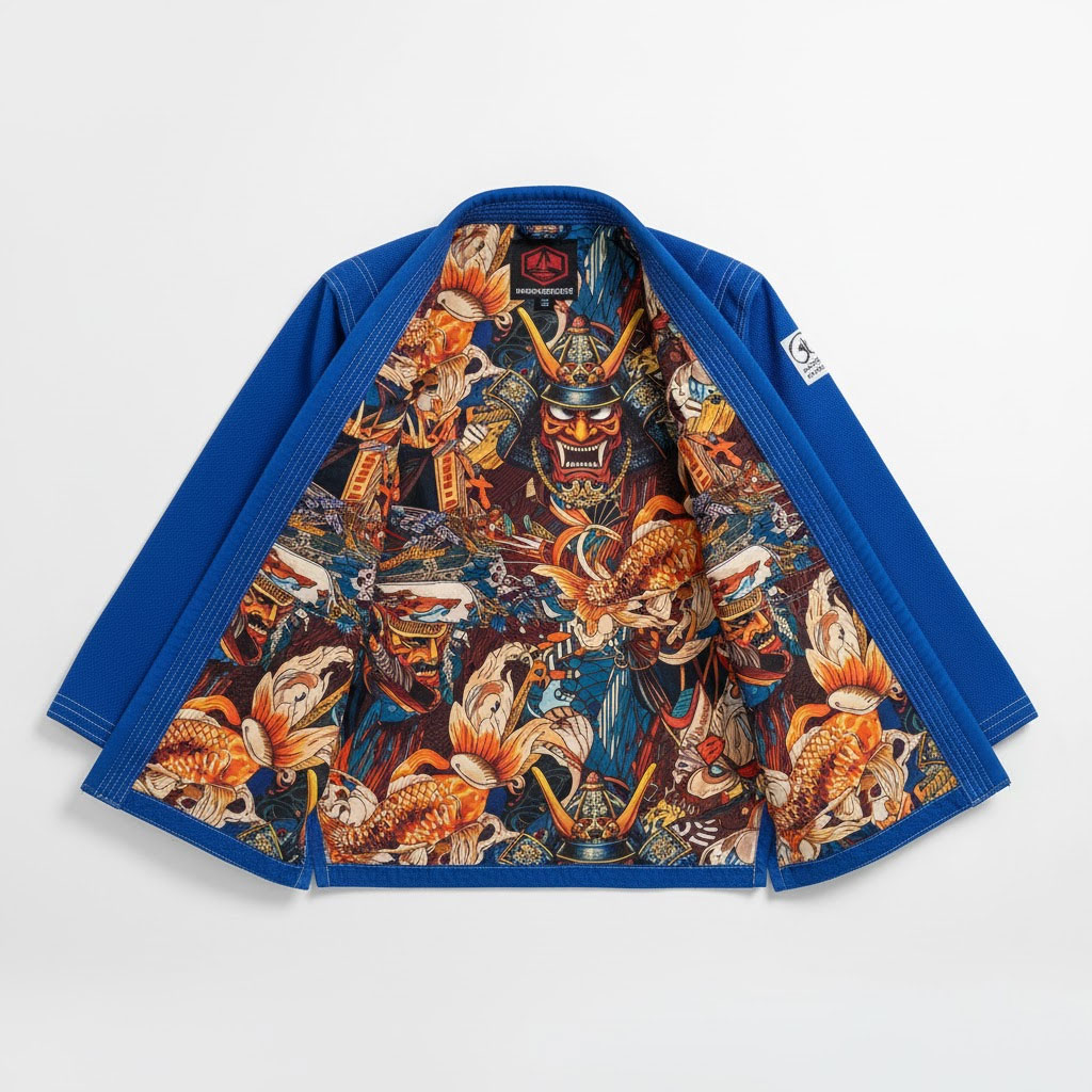 The Samurai Spirit Lined BJJ Gi is a Royal Blue performance gi featuring an exclusive, full-sublimation inner lining with a striking Japanese-inspired design. Enjoy unmatched comfort, superior sweat management, and a unique style that remains hidden until you open your lapel. Compete legally, train comfortably, and inspire with every roll.